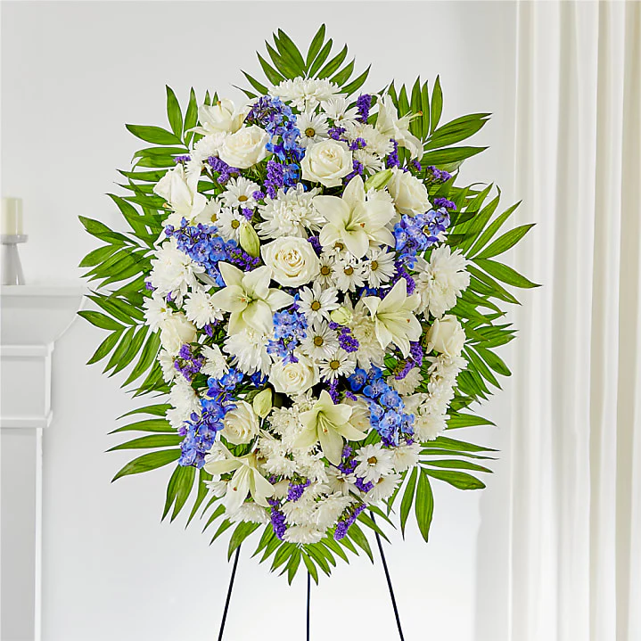 Pay your respects with a standing tribute of white and blue florals, carefully styled to express the words that may be hard to find.
