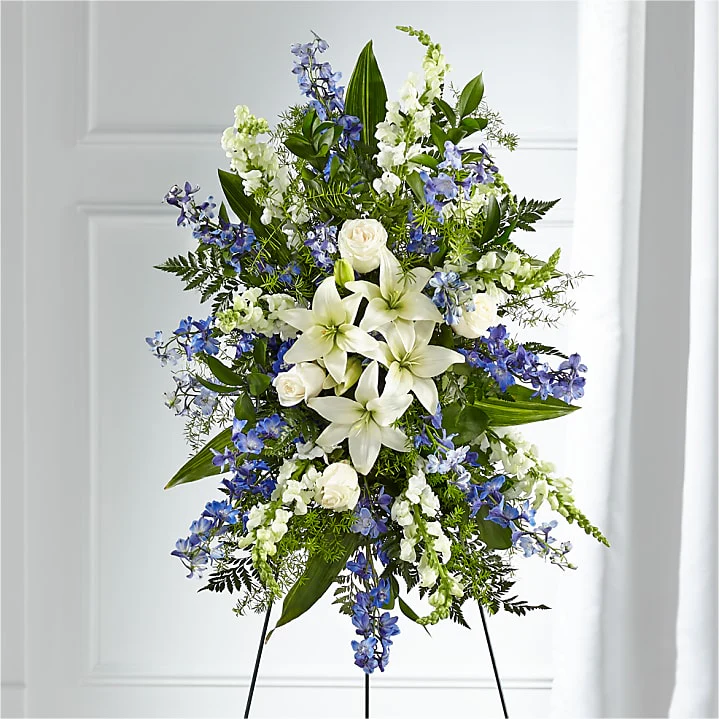 A collection of bold blue flowers shares a tribute that words cannot express. Designed with lilies, roses, delphinium and snapdragons our Faithful Friend Standing Spray is a grand gesture to express kindness and solace to a loved one.